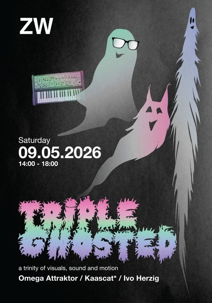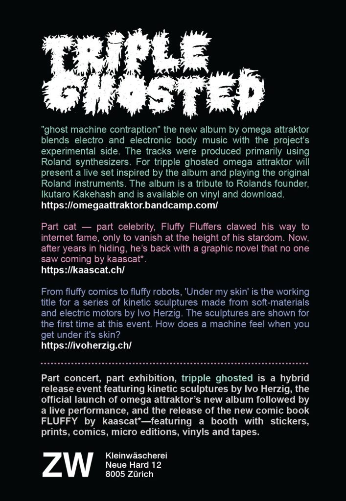„triple ghosted“ ist teils Konzert, teils Ausstellung und präsentiert sich als hybrides Release-Event mit kinetischen Skulpturen von Ivo Herzig, der offiziellen Veröffentlichung des neuen Albums von omega attraktor auf Vinyl, vorgestellt mit einem Live-Auftritt, sowie der Veröffentlichung des neuen Comics „FLUFFY“ von kaascat* – mit einem Stand, an dem Aufkleber, Prints, Comics, Kleinauflagen, Schallplatten und Kassetten angeboten werden.
